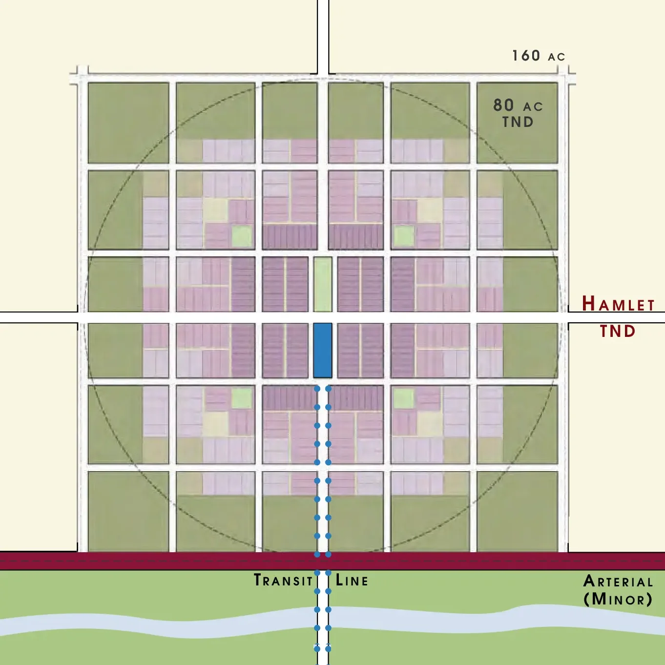 • TRANSIT: Pedestrian sheds (short, medium, and long) set the placement of transit nodes to reduce auto dependence.